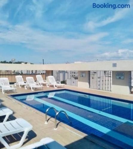 Boasting air-conditioned accommodation with a private pool, city view and a patio, Flat perto da praia com piscina na cobertura is situated in São Vicente. This beachfront property offers access to a balcony, free private parking and free WiFi.